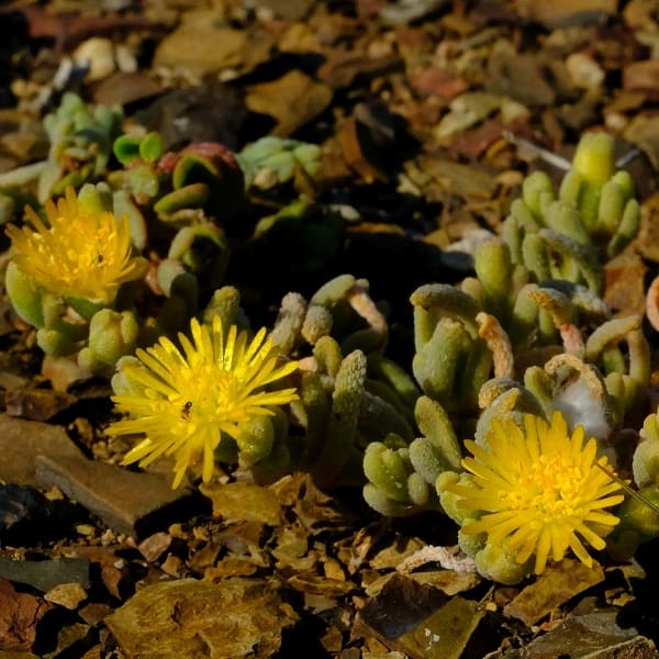 With its fleshy, triangular leaves and compact growth habit, this Mesembryanthemum succulent is a great choice for small gardens or containers. It produces bright yellow flowers.